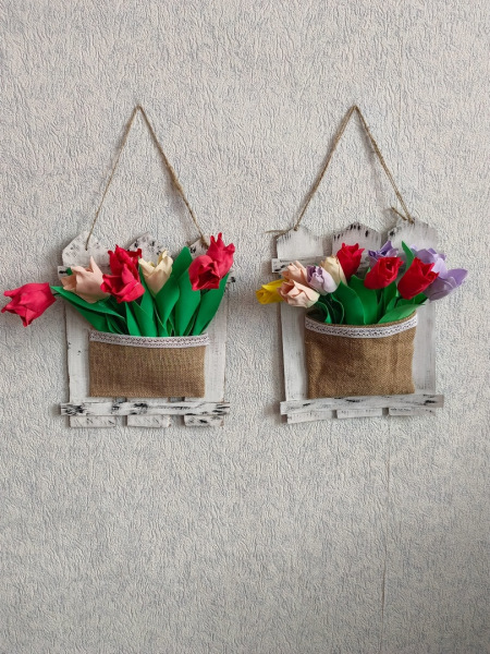 В отделении дневного пребывания отдыхающие сделали весеннюю композицию с тюльпанами из фоамерана.
